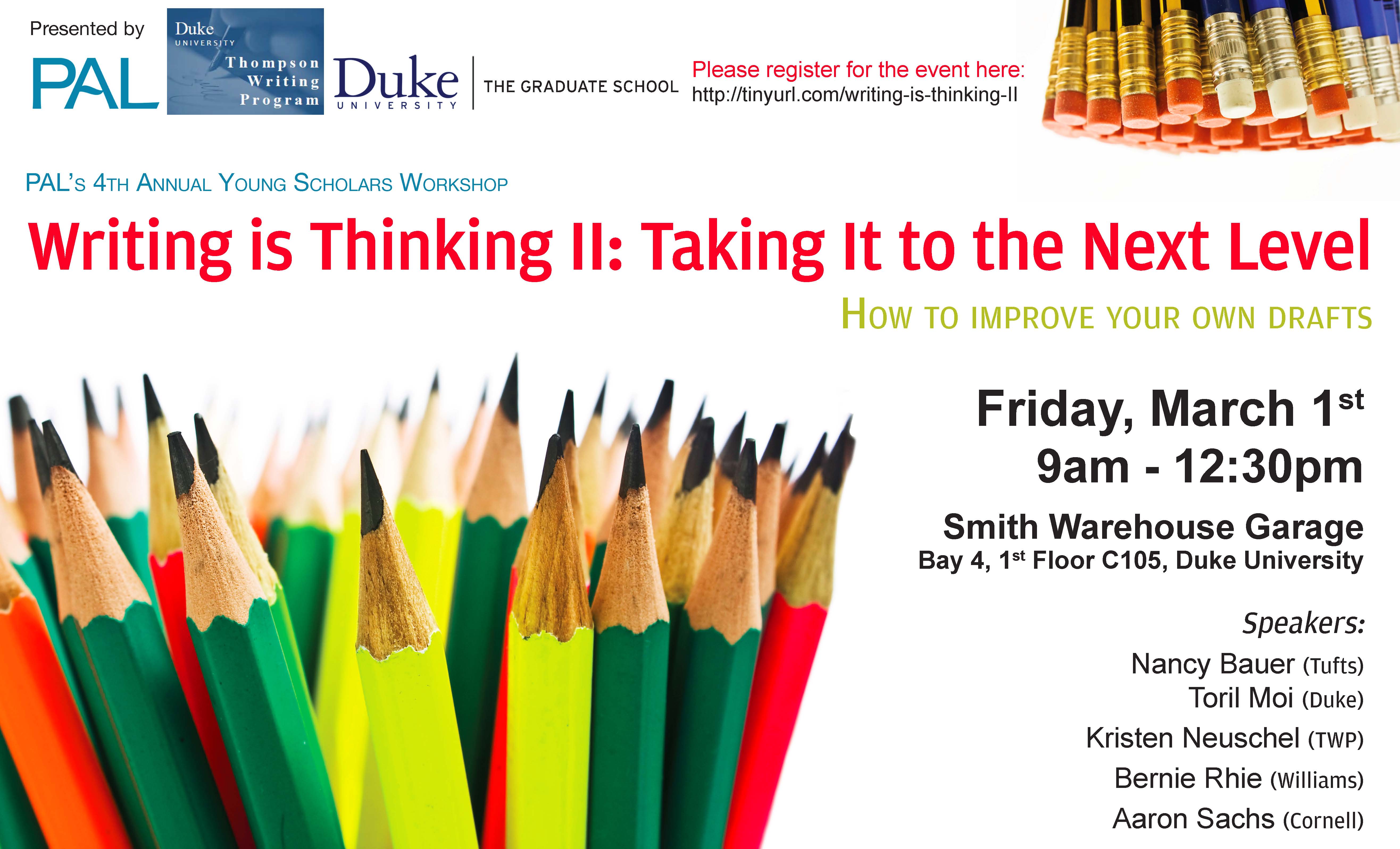 Writing is Thinking II provides a unique opportunity for graduate students and other young scholars at Duke to develop their craft and to get inspiration for their future life of writing and thinking. Because Writing is Thinking II is also The 4th Annual Young Scholars Workshop, it contains a public morning event and an afternoon workshop limited to 16 participants.