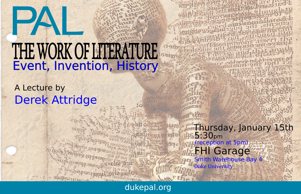 Derek Attridge will present a section from his forthcoming book, The Work of Literature, a sequel to The Singularity of Literature that expands and refines its arguments. The new book is partly in the form of a self-interview or cross-examination; the lecture will include a portion of this material, discussing some of the key terms proposed in the earlier account of the specificity of literature as a cultural and linguistic practice and considering their possible role in understanding the apparent transcendence of historical time that literary works seem able to achieve.