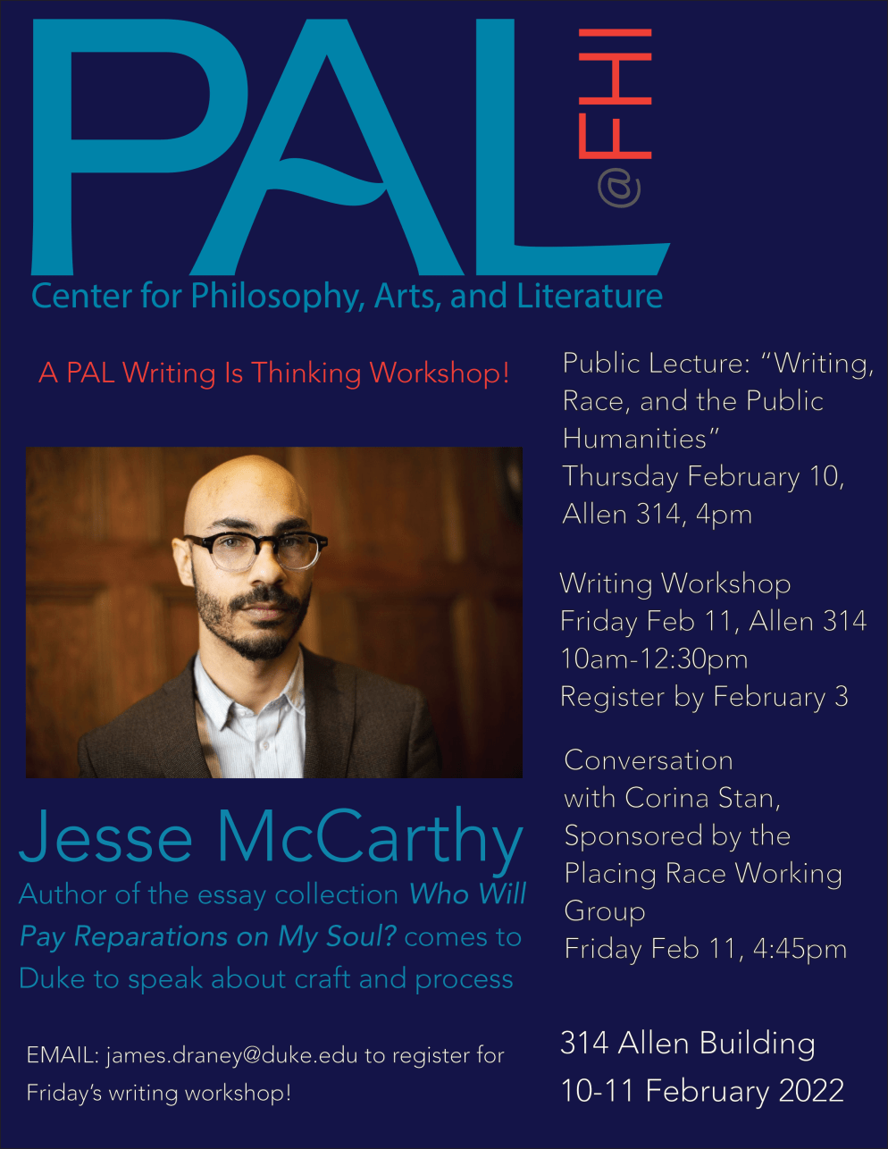 The Center for Philosophy, Arts, and Literature is sponsoring a two-day event with Jesse McCarthy, author of the essay collection Who Will Pay Reparations on My Soul? McCarthy will speak about craft and process. There will be a public lecture, “Writing Race, and the The Center for Philosophy, Arts, and Literature is sponsoring a two-day event with Jesse McCarthy, author of the essay collection Who Will Pay Reparations on My Soul? McCarthy will speak about craft and process. There will be a public lecture on Thursday evening, February 10, a writing workshop the morning of Friday, February 11, and an informal open discussion with Professor Corina Stan, sponsored by the Placing Race Working Group, Friday afternoon (February 11). All faculty are encouraged to attend.