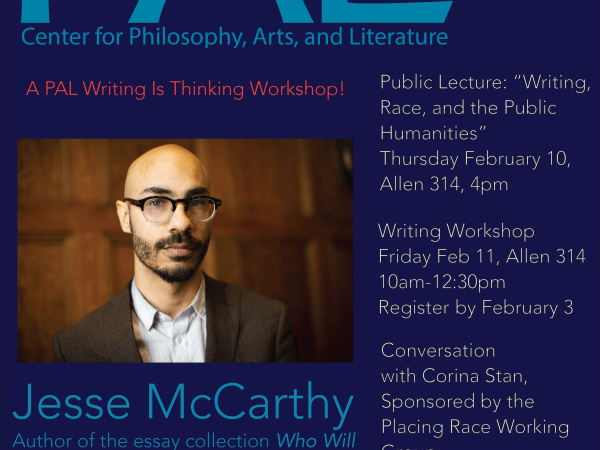 The Center for Philosophy, Arts, and Literature is sponsoring a two-day event with Jesse McCarthy, author of the essay collection Who Will Pay Reparations on My Soul? McCarthy will speak about craft and process. There will be a public lecture, “Writing Race, and the The Center for Philosophy, Arts, and Literature is sponsoring a two-day event with…Read more