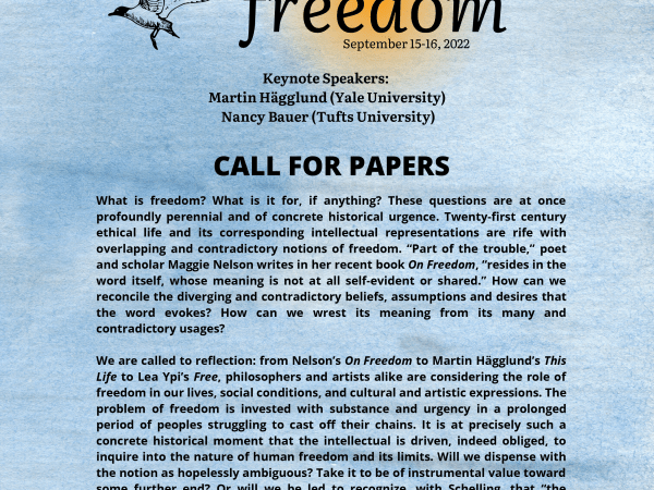 PAL is pleased to announce the 2022 Stanford-Duke Graduate Conference in Philosophy and Literature. The conference will be held on September 15-16at Duke University. Our keynote speakers are Nancy Bauer (Tufts) and Martin Hägglund (Yale). Please submit abstracts of 250 words, and a short bio, to dukestanford2022@gmail.com. Applicants will hear back about their submissions in early July. This conference…Read more