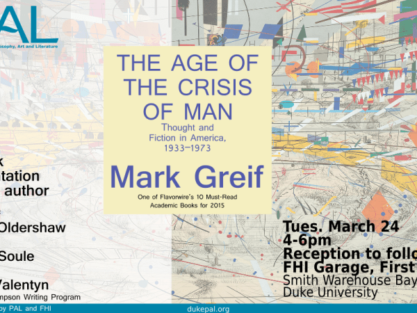 The Age of the Crisis of Man: Thought and Fiction in America, 1933-1973 by Mark Grief 4-6pm FHI Garage Smith Warehouse, Bay 4, First Floor Duke University Reception to Follow A book presentation by the author Respondents: Myles Oldershaw (English) Jacob Soule (Literature) Brian Valentyn (English/Thompson Writing Program) One of Flavorwire’s 10 Must-Read Academic Books for…Read more