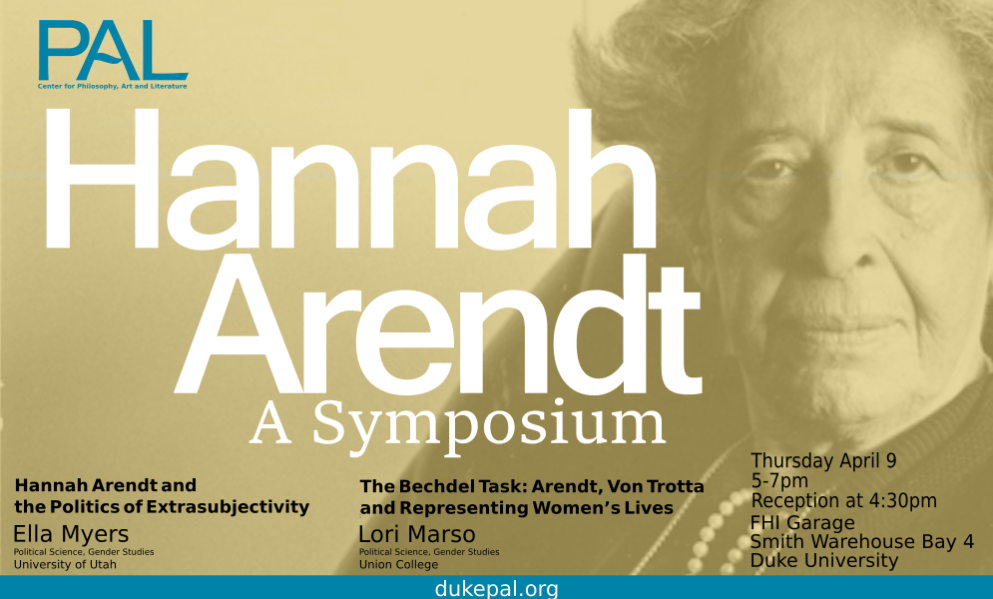Part of the PAL Intellectual Women Series Thurs. April 9 5pm-7pm Reception at 4:30pm FHI Garage Smith Warehouse Bay 4 Duke University The Bechdel Task: Arendt, Von Trotta, and Representing Women’s Lives by Lori Marso (Political Science, Gender Studies, Union College) Hannah Arendt and the Politics of Extrasubjectivity by Ella Myers (Political Science, Gender Studies, University of Utah)